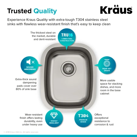 - Premium Grade T-304 Stainless Steel: There are two primary types of stainless steel in the market: T-409 and the higher quality T-304. The difference lies in chromium and nickel contents; T-409 with 11% and .5% respectively, T-304 with 18% and 10%. When added to steel, these two metals prevent oxidation and rust by neutralizing sodium chloride (salt) – a common element in everyday kitchens. While cheaper sinks use T-409, Kraus sinks boast T-304, further lending to the lifetime warranty.