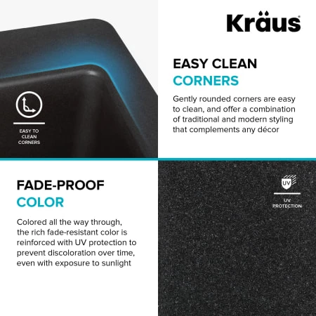 - Kraus Granite Composite: Crafted from 80% natural granite, Kraus granite sinks feature the look, feel, and texture of natural stone. A thermal finishing process results in a tough, nonporous surface that is resistant to heat, chemicals, scratching, chipping, and discoloration that will stand up to a lifetime of use. With a variety of size, bowl configuration and installation options, a Kraus granite sink can make a sleek and functional addition to any kitchen.