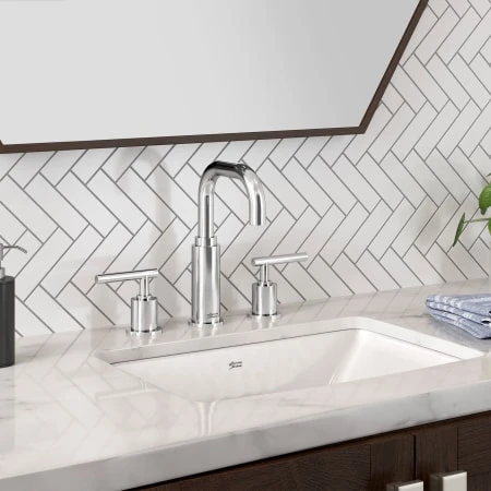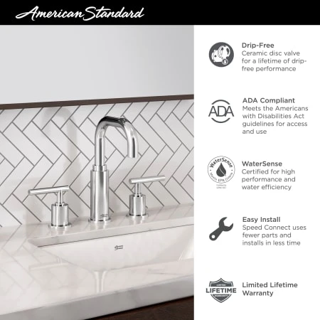 The Serin widespread bathroom faucet from American Standard features a modern, clean design for a contemporary or modern bathroom. Longer ADA approved metal lever handles accompany a streamlined spout for a faucet that excels in both form and function. Created from fine brass, this metal faucet is designed for prolonged exposure to water, giving it a long-lasting durability with no-drip performance that lasts for a lifetime thanks to an innovative ceramic disc valve cartridge. The exlcusive speed connect drain uses fewer parts, installing in a fraction of the time compared to an ordinary faucet. Features modern, bold design with longer metal lever handles; Speed connect metal drain makes installation easy, with fewer parts and no adjustments required. Ceramic disc valve cartridge ensures a lifetime of drip-free performance. Adjustable hot limit safety stop allows you to limit the amount of hot allowed to mix with cold, to help prevent accidental scalding. ADA Compliant for handicap accessible use. Lead Free Performance. 1.2 gallons per minute (1.2 gpm/4.5 L/min) maximum flow rate helps to save water; brass valve bodies with flexible hose connections for 6″ to 12″ (152 to 305 mm) installations. 1/4 turn washerless ceramic disc valve cartridges 20 inch (500 mm) long flexible stainless steel drain cable is pre-assembled to spout. Metal Speed Connect drain body with 1-1/4 inch (32 mm) tail piece Sustainability CEC Listed CALGreen Compliant.