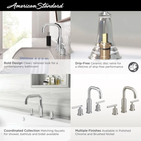 - Lifetime Warranty: As an American company, American Standard faucets are built tough. Their products live longer in one place than most people do. Drip-free ceramic disc valves, high-grade lead-free brass alloys, and stainless steel drain cables name just a few of the features which make American Standard bathroom faucets the industry’s longest lasting. To back this up, all American Standard faucets are covered under a lifetime warranty.