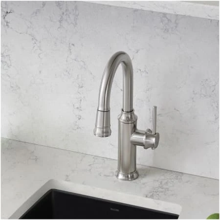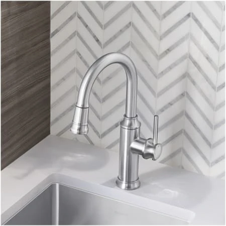 Two worlds collide with the EMPRESSA Pull-Down Bar Faucet – modern features with traditional, old world detailing. Inspired by German wine country, the EMPRESSA Bar Faucet is modeled after the shape of vintage wine presses found across Europe. Characterized by signature details such as vintage wine press-inspired handles and an integrated pull-down single-function spray, the EMPRESSA is the perfect example of classic European design infused with modern features and functionality. The EMPRESSA can be easily installed in kitchen islands, wet/dry bars, or smaller kitchens with less clearance space.