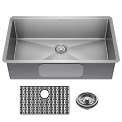 - Sink kit includes: stainless steel kitchen sink, black silicone bottom grid, stainless steel drain assembly w/ strainer