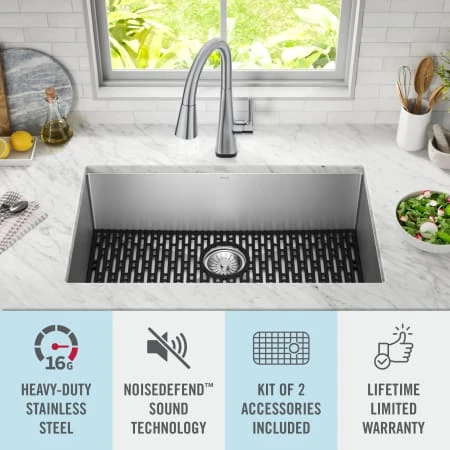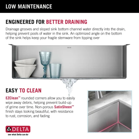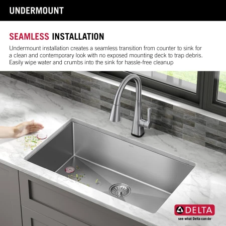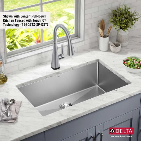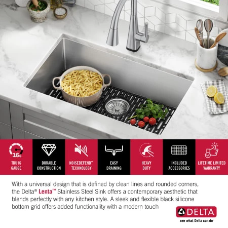 The Delta® Lenta™ Stainless Steel Sink Collection is defined by sleek lines and rounded corners, offering a contemporary aesthetic that blends perfectly with any kitchen style. The undermount design installs seamlessly for a clean look with no exposed mounting deck, allowing you to wipe water and crumbs straight into the sink. Heavy-duty TRU16™ gauge stainless steel construction offers lasting durability with resistance to dents and damage, while smooth SatinSheen™ finish creates an easy-to-clean surface so your sink stays beautiful with less effort. The deep single bowl offers plenty of room to wash large items while helping to contain mess and splatter inside the sink. The kit comes with a stylish black silicone bottom grid that helps protect the sink surface and promotes better drainage by keeping dishes and heavy cookware elevated. Multi-layer NoiseDefend™ soundproofing helps reduce noise and vibration while the sink is in use. A sloped bottom with channel grooves improves drainage, while EZClean™ corners help reduce build-up over time. The installation-ready kit comes with all mounting hardware and a stainless steel drain assembly to get your home improvement project moving fast. This sink pairs with the Lenta™ Pull-Down Kitchen Faucet with Touch2O® Technology for flexible functionality and a coordinated look. Lenta™ kitchen sinks are backed by a Lifetime Limited Warranty so that you can choose Delta® products with confidence