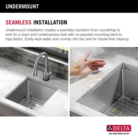 - Undermount sink installs seamlessly to create a clean look with no exposed mounting deck, allowing you to wipe water and crumbs into the sink