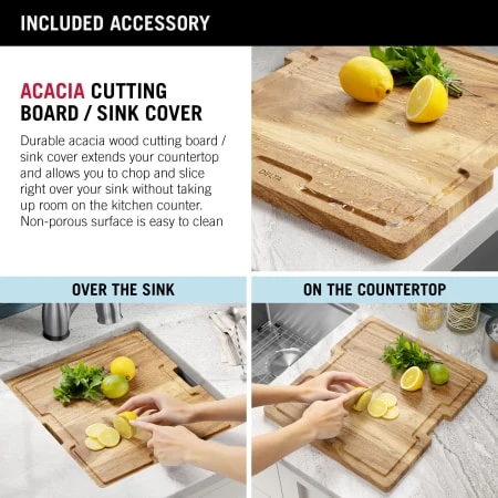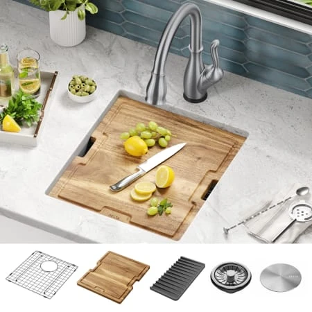 - Kit includes: sink, acacia cutting board w/ mobile device holder, silicone drying mat, stainless steel bottom grid, stainless steel drain assembly w/ removable cover