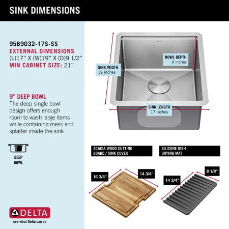 - Outer sink dimensions: 17″ L x 19″ W x 9.5” D