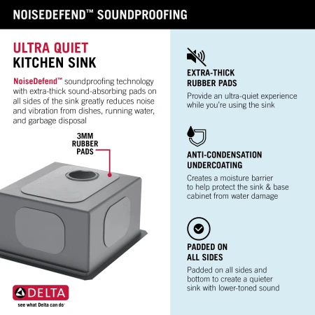 - Extra-thick sound-absorbing pads on all sides of the sink greatly reduces noise and vibration while the sink is in use