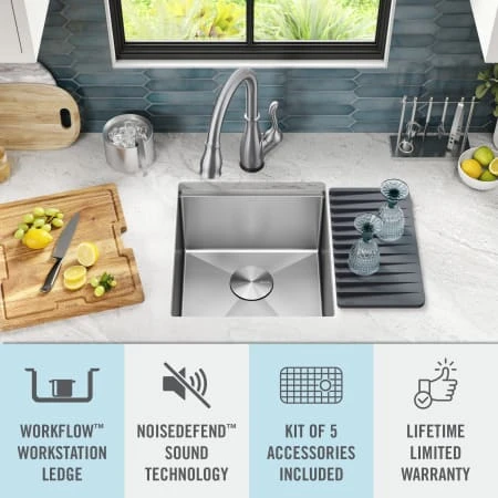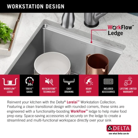 The Delta® Lorelai™ Workstation Collection is defined by sleek lines and gently rounded corners, offering a clean transitional look that blends perfectly with any kitchen style. These sinks are designed with a built-in WorkFlow™ ledge that helps make food prep easy by allowing you to slide accessories across the sink, creating a multifunctional workspace for seamless transition between tasks. The kit includes a durable cutting board and roll-up dish rack with removable utensil holder that allow you to combine prepping and cleaning in one convenient location. Heavy-duty TRU16™ gauge construction offers lasting durability so that you can use your sink with confidence. The undermount design installs seamlessly to create a clean look with no exposed mounting deck, allowing you to easily wipe water and crumbs into the sink. The deep single bowl offers enough room to wash large items while containing mess and splatter inside the sink. NoiseDefend™ soundproofing reduces noise and vibration from dishes, water, and garbage disposal. SatinSheen™ finish provides a smooth surface that’s easy to clean, so your sink stays beautiful with less effort. Channel grooves and a sloped bottom improve drainage, while EZClean™ corners reduce build-up over time. The installation-ready sink includes all mounting hardware and a stainless steel drain assembly to get your installation moving fast. You can feel comfortable in your kitchen knowing that Delta® sinks are backed by a Lifetime Limited Warranty