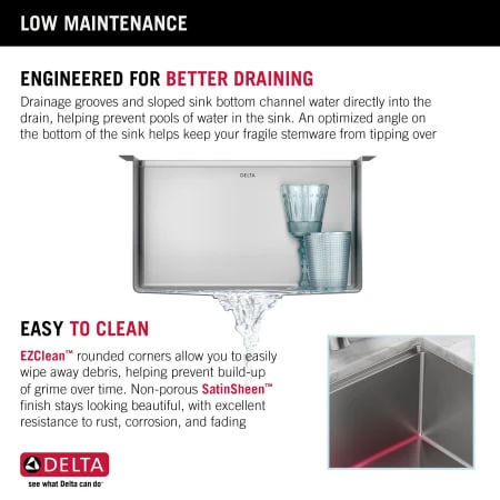 - Non-porous surface and tightly rounded EZClean corners on the bottom of the sink that help prevent buildup over time