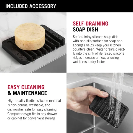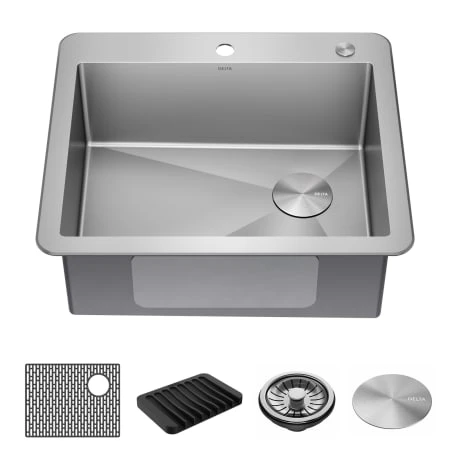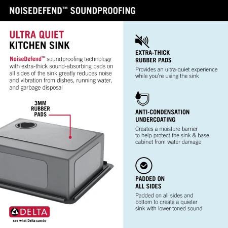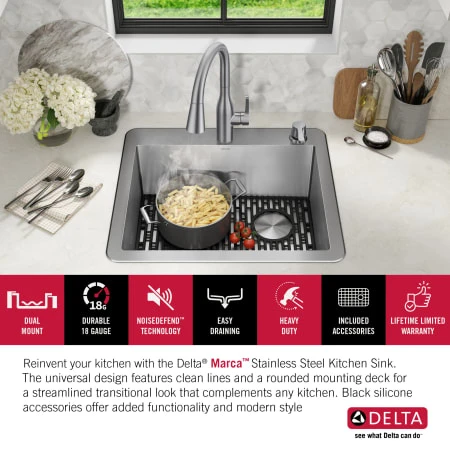 The Delta Marca Kitchen Sink Collection features clean lines and a gently rounded mounting deck for a streamlined transitional look that complements any kitchen style. A great renovation solution that allows you to use an existing countertop cutout, the dual-mount design can be installed as an undermount or as a drop-in sink with any kitchen counter material. The thick 3.5mm mounting deck creates a finished look, with two pre-drilled holes for installing a kitchen faucet and soap dispenser. Heavy-duty 18-gauge construction offers lasting durability, with an easy-to-clean surface so your sink stays beautiful with less effort. The deep single bowl design fits large items while containing mess and splatter. The kit comes with a bottom grid that helps protect the sink surface and a self-draining soap dish/sponge holder for a cohesive modern look. Multi-layer soundproofing reduces noise and vibration while the sink is in use. Sloped bottom with channel grooves improves drainage, while corners help reduce build-up over time. The installation-ready sink comes with all mounting hardware and a stainless steel drain assembly to get your DIY project moving fast. This sink pairs with the Marca pull-down kitchen faucet and matching soap dispenser for a coordinated look. Our sinks are backed by a Lifetime Limited Warranty so that you can choose Delta products with confidence