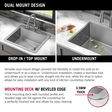 - Dual installation – sink can be installed under the countertop or be dropped into a cutout in the countertop