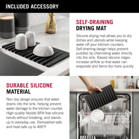 - Sink kit includes: sink, wood fiber cutting board, silicone drying mat, stainless steel bottom grid, stainless steel drain assembly w/ removable cover