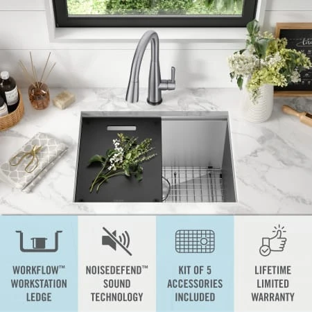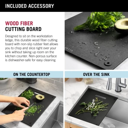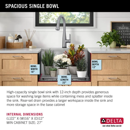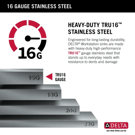 The Delta® Rivet™ Workstation Collection is defined by clean lines, tightly rounded corners, and modern accessories that offer a streamlined contemporary look. A perfect addition to any utility room, mud room, laundry room, or kitchen, this sink is engineered with an integrated WorkFlow™ ledge to support sliding accessories, creating a multifunctional work surface for seamless transition between tasks. The kit includes a self-draining silicone drying mat with non-slip surface and a heavy-duty wood fiber cutting board that adds workspace over the sink. The 12-inch deep single bowl offers ample room for handling the dirtiest tasks, including soaking laundry, watering plants, or even bathing your pet! Heavy-duty TRU16™ gauge stainless steel offers lasting durability so you can use your sink with confidence. The undermount design installs seamlessly to create a clean look with no exposed mounting deck for easy cleanup. NoiseDefend™ soundproofing reduces noise and vibration from dishes and garbage disposal. SatinSheen™ finish provides a smooth surface that’s easy to clean, so your sink stays beautiful with less effort. Channel grooves and a sloped bottom help improve drainage, while EZClean™ corners on the bottom of the sink reduce build-up over time. The sink kit includes mounting hardware, protective bottom grid, and a drain assembly to get your installation moving fast. You can feel comfortable in your kitchen knowing that Delta sinks are backed by a Lifetime Limited Warranty