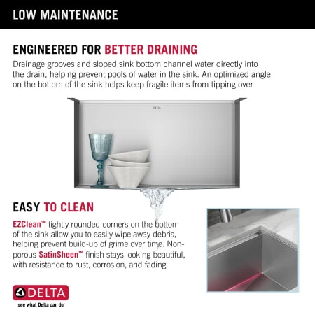 - Non-porous surface and tightly rounded EZClean corners on the bottom of the sink that help prevent buildup over time