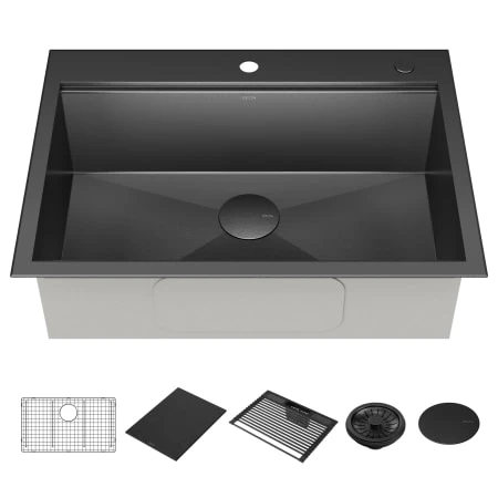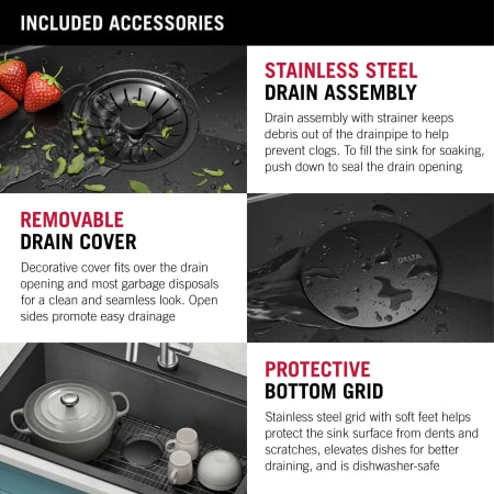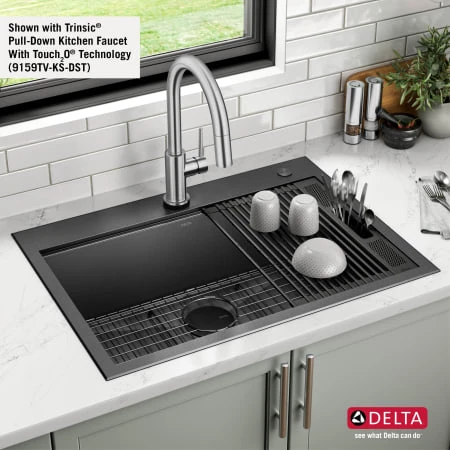 Offering a striking option for kitchen sinks, Delta Rivet Drop-In Top Mount Workstation Sinks feature clean lines, tightly rounded corners, and modern accessories that make a bold statement in any space. Designed with a built-in ledge that supports sliding accessories, these sinks create a multifunctional workspace for seamless transition between tasks. The cutting board and roll-up dish drying rack enhance the modern aesthetic of your sink while allowing you to prep and clean in one convenient location. Made from heavy-duty 16 gauge stainless steel, these sinks offer lasting durability and easy maintenance. The sink surface has enhanced resistance to corrosion and scratches and helps prevent water spots and fingerprints. Ideal for retrofitting, top mount design installs as a drop-in sink with any kitchen countertop. Thick mounting deck with 2 pre-drilled holes allows for installation of kitchen faucet and soap dispenser. Soundproofing reduces noise and vibration while the sink is in use. The deep single bowl with gently sloped bottom and channel grooves fits plenty of dishes and helps ensure easy drainage while containing mess and splatter inside the sink. Sink kit includes bottom grid, drain assembly, and mounting hardware. Backed by a Lifetime Limited Warranty so you can choose Delta products with confidence