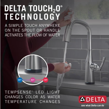 - Touch2O Technology: Sometimes your hands could use a hand, which is why we designed Delta® Touch2O Technology for the kitchen. With a simple touch anywhere on the spout or handle using your wrist or forearm, you can start or stop the flow of water from your faucet. The temperature and flow rate are easily set by your faucet handle for simple operation, designed to make everyday kitchen tasks a little easier. The built-in Delta TempSense™ LED light at the base of the faucet indicates the temperature of the water, eliminating any possible surprises or discomfort. Touch it on. Touch it off. Experience the convenience and control of Delta kitchen faucets featuring Touch2O Technology.