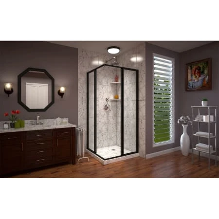 The DreamLine Cornerview sliding shower enclosure provides a modern solution to maximize space with a corner installation and center opening design. The Cornerview has a straight edged style that provides a comfortable showering space. The Cornerview can fit into virtually any corner, making it perfect for smaller bathrooms. Instantly upgrade the look and feel of your bath space with the Cornerview sliding shower enclosure.
