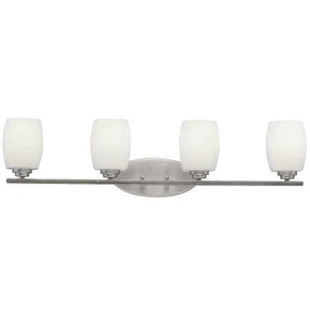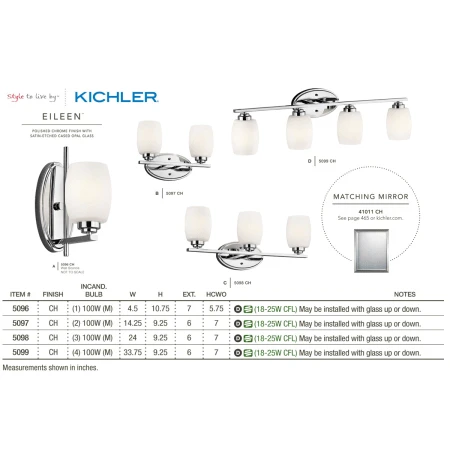 This transitional bathroom light fixture from the Eileen collection is available in brushed nickel, chrome, and olde bronze finishes. This fixture measures 34 inches wide and 9.5 inches tall and it is also available in 6 additional sizes. This product can be mounted with the glass facing up or down.