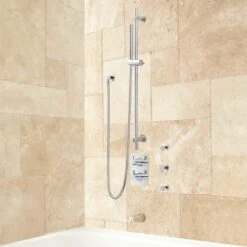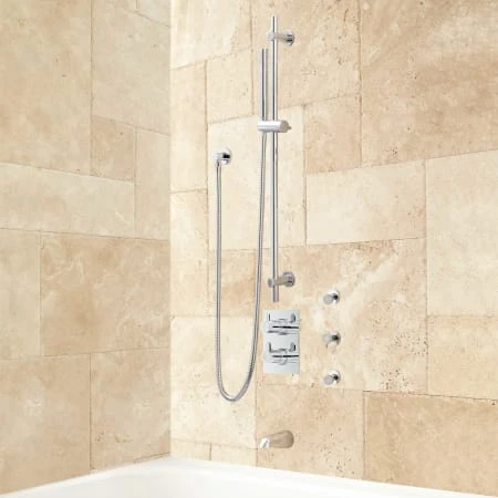 The Hinson Tub and Shower Set comes with a slide bar to adjust the hand shower to meet your needs. This premium product has features that go beyond standard bathroom fixtures. The Hinson includes three body sprays to massage and caress the body.