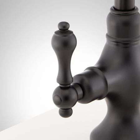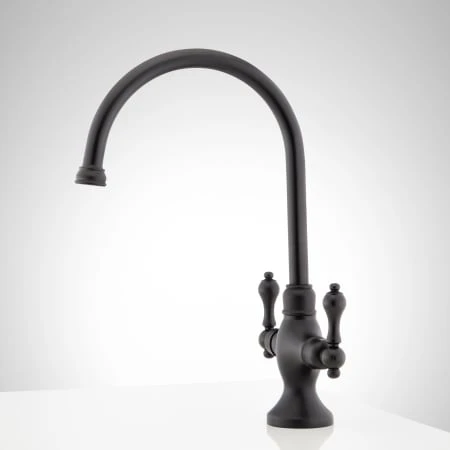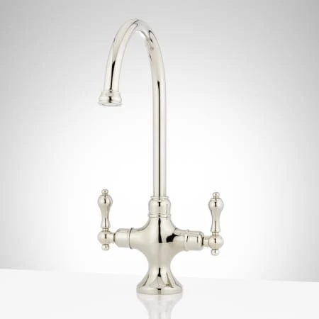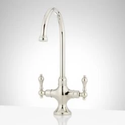 This single-hole faucet features a traditional gooseneck spout and dual-lever handles. This faucet can be used with a kitchen sink or a bar sink.