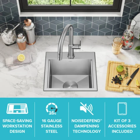 Cook, serve, and entertain in style with KRAUS Kore Workstation Sinks. Engineered with an integrated ledge to support custom accessories, this compact kitchen bar sink creates a multifunctional workspace that will supercharge the functionality of your bar or entertainment area. The space-saving design makes this sink ideal for use in galley kitchens, RVs, or as an auxiliary prep sink. The kit includes a durable bamboo cutting board/sink cover that extends your countertop space by allowing you to chop and slice right over the sink. Kore sinks are made with KRAUS TRU16 stainless steel – our thickest 16-gauge steel – for maximum durability with resistance to dents and damage. Perfect for DIY installation, the drop-in design installs as a top mount with any type of countertop material. The extra-thick mounting deck sits flat against the countertop for a perfectly finished look, with a beveled edge for easy cleaning and 1 pre-drilled hole for easy installation of a kitchen or bar faucet. Thick NoiseDefend sound dampening pads help absorb noise and vibration. The wear-resistant finish is easy to clean and not prone to corrosion, while rounded corners on the sink bottom reduce buildup over time. Channel grooves and a sloped bottom help improve drainage, with a rear-set drain that adds storage space underneath the sink. The installation-ready kit comes with mounting hardware and a drain assembly with matching cover.