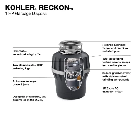 Keep your kitchen sink cleaner and decrease the amount of food waste in landfills with the KOHLER Reckon 1 HP garbage disposal. With a heavy-duty induction motor and two stages of grinding power, this compact, continuous-feed disposal is easy-to-use, durable, and reliable for your daily routine. Also featuring a sound-reducing removable sink baffle and auto-reverse, the Reckon 1 HP disposal was designed to make an impact in your home—and the environment.