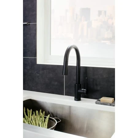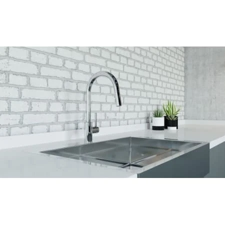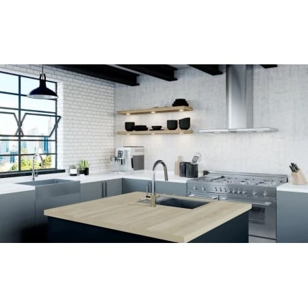 - High-arch gooseneck spout further allows for unobstructed sink access