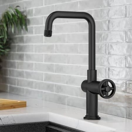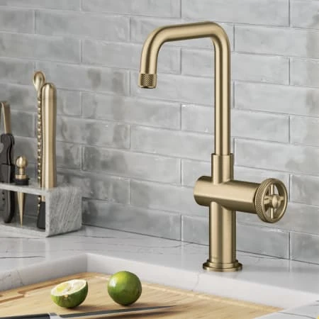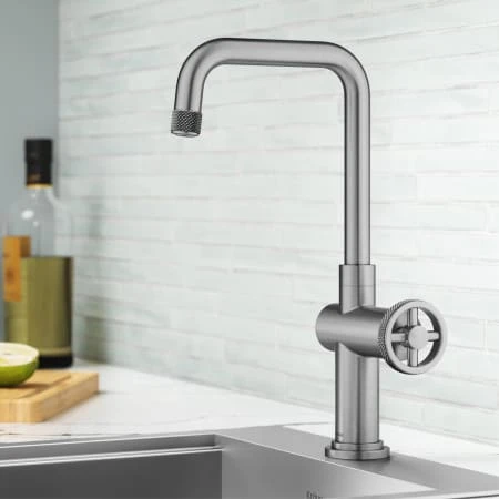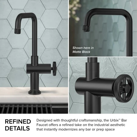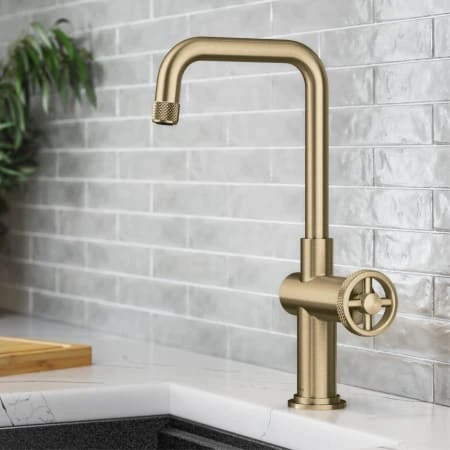 The Urbix Industrial Bar Faucet brings rugged sophistication to any bar, prep, or entertainment area, with an angular silhouette and diamond-textured accents for a bold industrial look. The wheel-shaped handle allows for smooth control of water temperature and diamond knurling provides a non-slip grip. The compact design is perfect for smaller kitchens where space is at a premium. Robust design features heavy-duty brass construction and premium components including ceramic cartridge and soft-touch aerator for lasting leak-free use. Spout swivels 360 degrees for easy access to every part of the sink. Available in a range of corrosion-resistant finishes including easy-to-clean Spot-Free finishes. Pre-attached water lines and mounting hardware included for easy DIY installation.