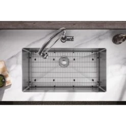 - Spout Reach: 21-1/2″ (center of faucet body to center of spout outlet)